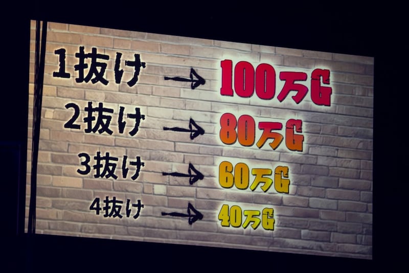 2戦目は、全員のダイスが5/6で脱落するという状態からスタート。もちろん2戦目の最下位にも罰ゲームはある。その餌食になったのは、まさかの1戦目勝者であるんそめだ。屈強なスタッフに肩で担がれ、罰ゲームの場へと運ばれるんそめ。