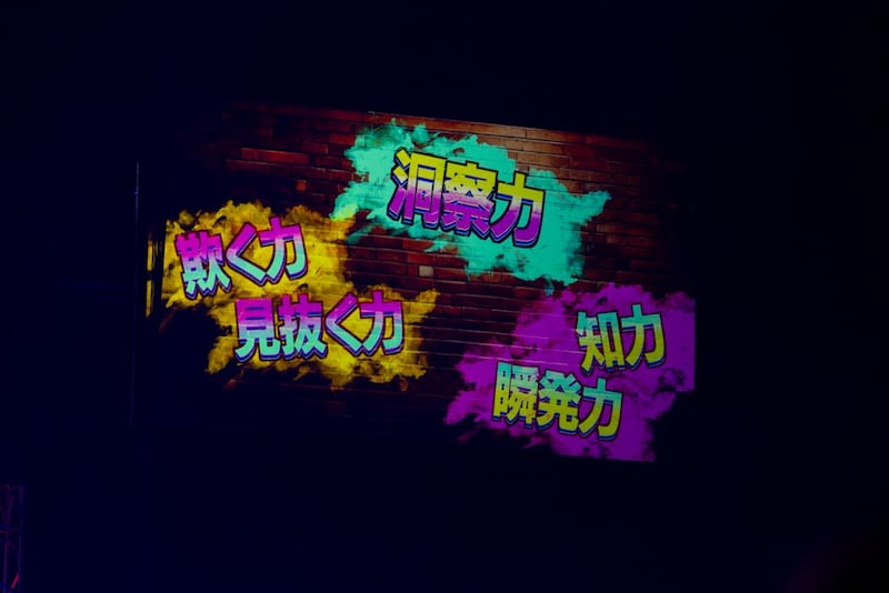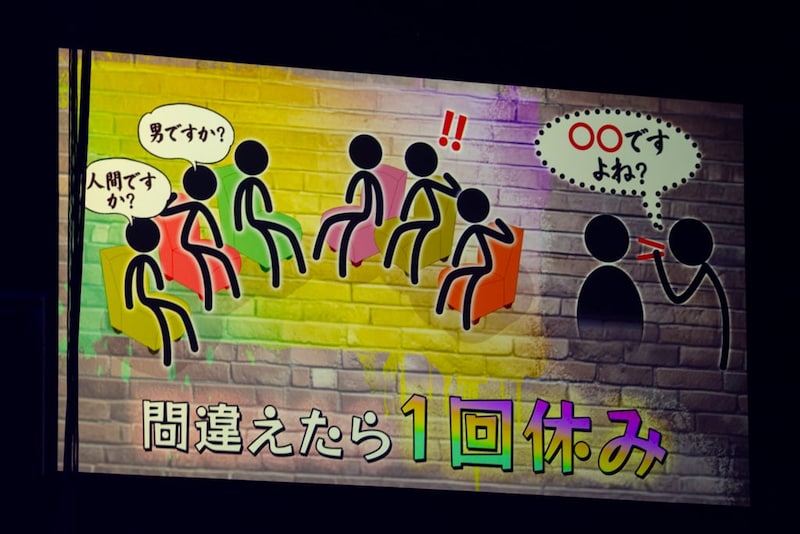 第1試合では、「洞察力」をテーマとして、「誰だ?なんだ?アキネーター」に挑戦。前回(2024年3月31日開催)も実施されて好評だった企画だ。6人には見えないよう、背後のスクリーンに映し出された「お題」についてメンバーが一人ひとり「それは人間ですか?」「実在しますか?」などの質問を投げ、来場者たちが「はい!」「いいえー!」と声を出してヒントを提供。客席のペンライトの色も大きなヒントとなる。先に「お題」がわかったメンバーから回答していく流れだ。