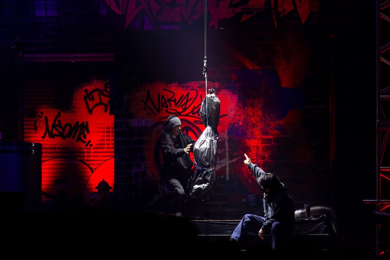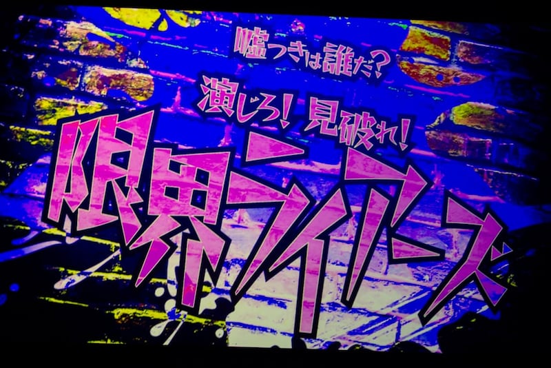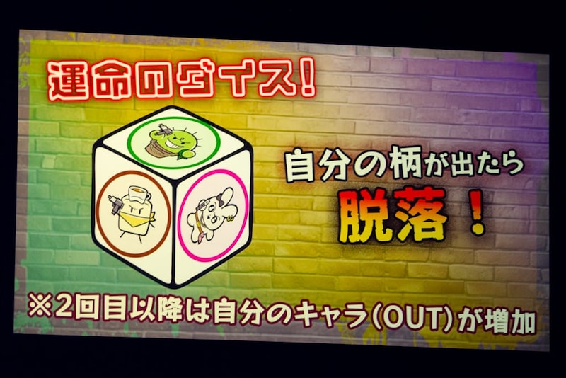 第2試合は「限界ライアーズ」。メンバーのアイコンが描かれたカードを使った、トランプの「ダウト」に近いゲームだ。嘘がバレたら「運命のダイス」で脱落か生存が決まる運試しに挑戦する。ゲームが進むごとに、ダイスによる脱落確率は上がる仕組みだ。そして、最初の脱落者はワイヤーでステージ上空へ宙吊りという地獄の罰ゲーム付きである。