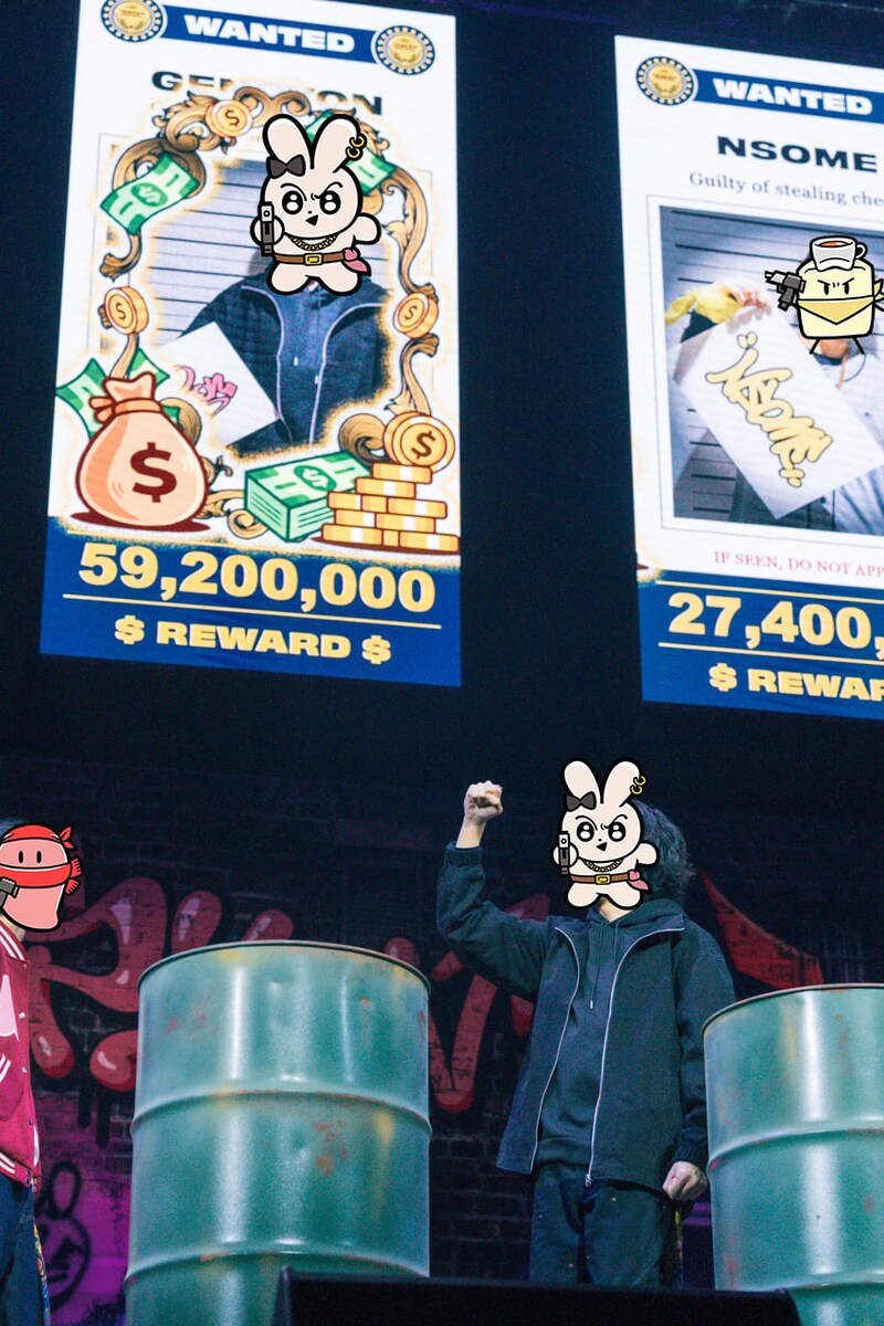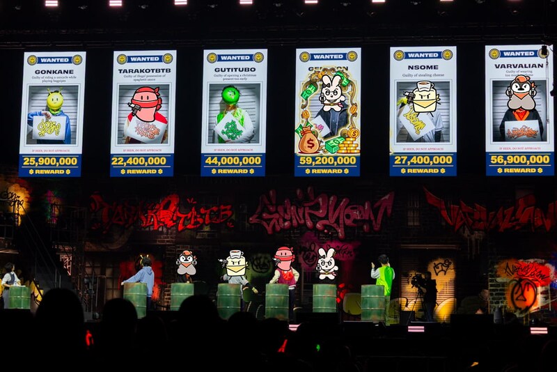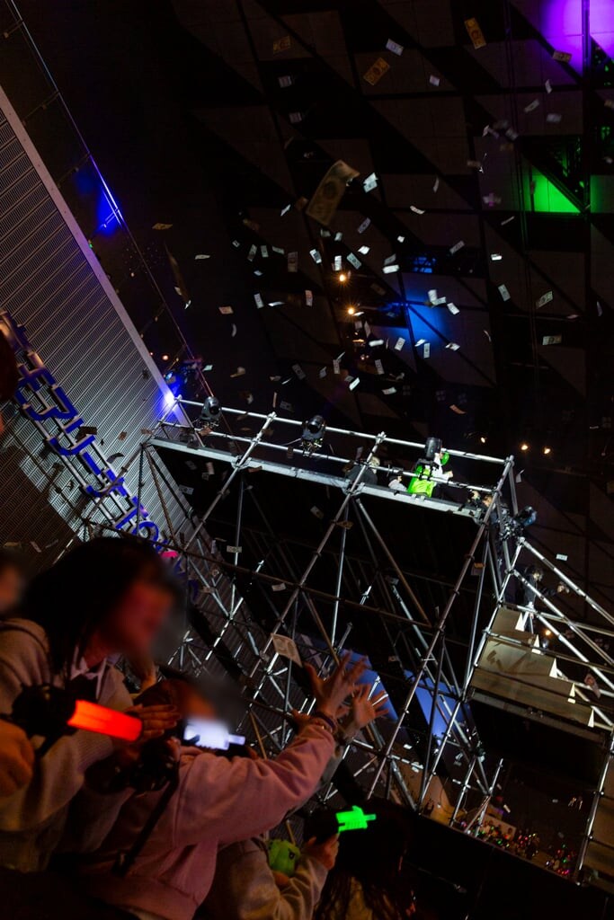 最後はメンバー全員、ホール後方のヤグラへ移動。リボルバーならぬ“マシンガン”を手にすると、小気味の良い発射音が会場に鳴り響いた。するとアリーナの前方・後方から限ナマ紙幣が次々と噴き出し、視界はしばし新紙幣で満たされた。