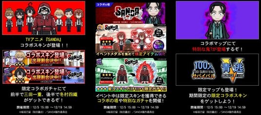 株式会社GOODROID(本社:東京都目黒区、代表取締役社長:松田和彬)は、最大100人のキャラクターが青鬼から逃げ回るマップの中で最後の一人として生き残ることを目指すオンライン・サバイバルゲーム『青鬼オンライン』にて、TVアニメ『SANDA』とのコラボを12月5日(金)15時より開始いたします。