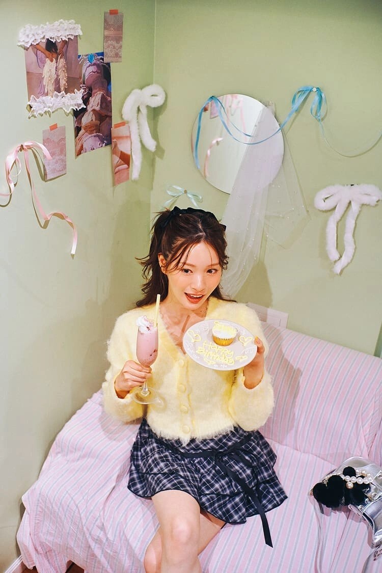 イエローニットカーデを主役に、チェックスカートと小さめバッグでガーリー全開。リボンやチャームでとことん盛れば、どんな場面でも写真映え間違いなし!