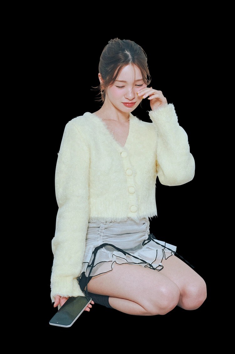 イエローカーデのふわもこ感に、リボンショートパンツで甘さと肌見せをプラス。イヤリングと白ソックスで抜け感を添えれば、おうちでの配信チェックも特別な“ときめき時間”にアップデート♡