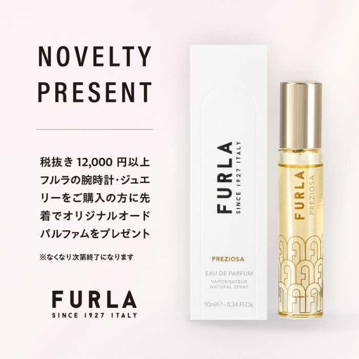 さらに、時計販売店またはWORLD WIDE WATCHでFURLAの時計・ジュエリーを12,000円(税抜)以上購入すると、先着でオリジナルオードパルファムがもらえるノベルティキャンペーンも実施。