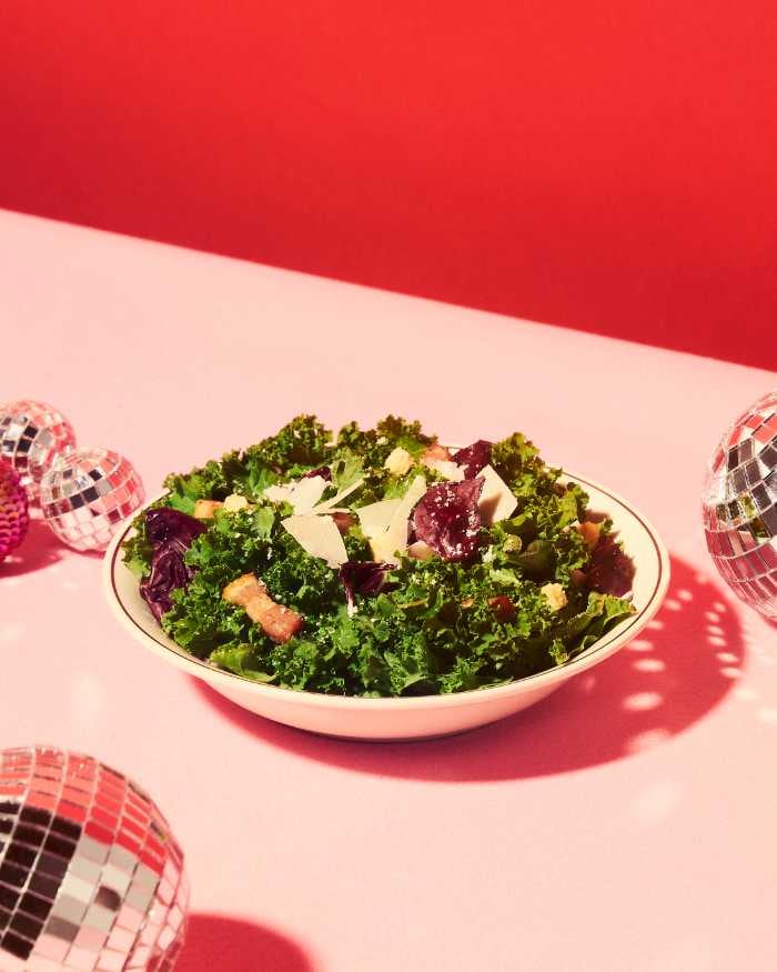 香ばしい生地と濃厚チーズが広がる大判ピザに、フレンチフライとチキンナゲット、シーザーサラダ、バナナスプリットがセットになった豪華なラインアップ。