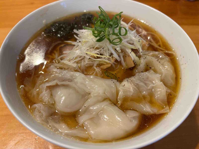 長崎県平戸市産焼きあごをメインに、丸鶏と佐助豚を重ねたスープ。ここに合わせるのは静岡県掛川市産の栄醤油と兵庫県たつの市産の末広醤油うす口をブレンドした醤油ダレ。ふんわりと上品なダシ感で素晴らしい美味しさ。ワンタンの皮は酒田ラーメン「満月」のとろける極薄皮だ。