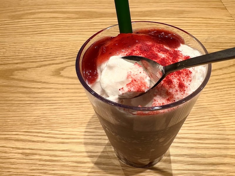 第一弾として登場した「レッド ラズベリー & ジョイフルメドレー ティー フラペチーノ(R)」は、ミルクを合わせた「ジョイフルメドレー」にラズベリー風味のシロップを加えた華やかな一杯。淡いピンクのティームースやラズベリーパウダーがアクセントとなり、ホリデー気分を一気に盛り上げてくれます。