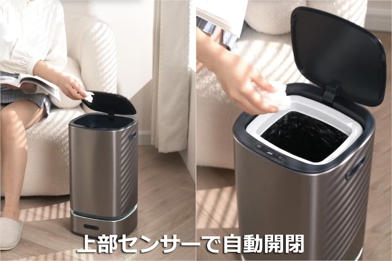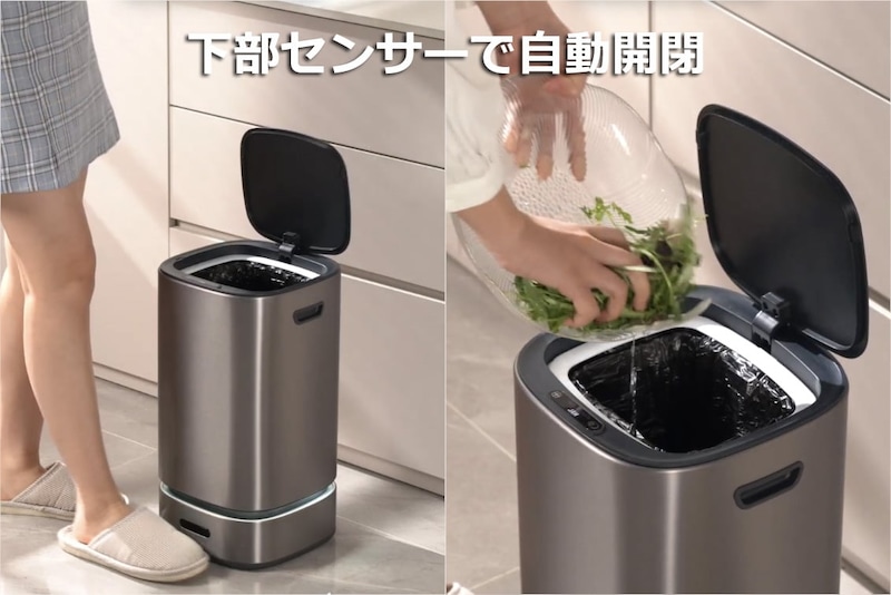 天面と下部の2か所にセンサーを搭載。この“二刀流センサー”により、手をかざしたり足をかざして自動で開閉できます。手が汚れていたり、両手がふさがっていても衛生的に開閉できるのが便利。