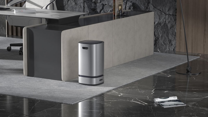 ステンレス製の本体は、寝室・リビング・キッチンなど好きな部屋に置いてしっくりなじむデザイン。容量は13リットルで、机の下や家具のすき間に設置しやすいサイズ感です。