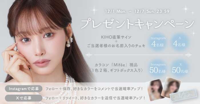 KIHO直筆サイン入りチェキや、好きなカラーを選べる「Mifée」の現品ギフトボックスが当たるチャンス。お気に入りの色を見つけたら、そのまま応募してみて♪