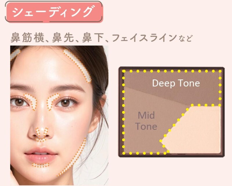 シェーディングは、輪郭や鼻筋の横、フェイスラインなど影を入れたい部分に塗布するのがおすすめです。
