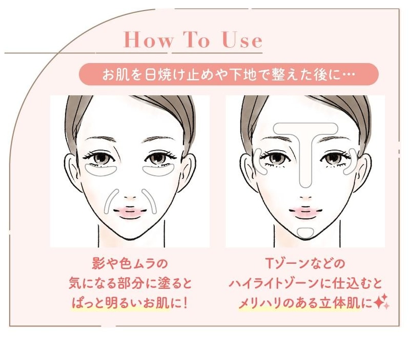 影や色ムラの気になる部分に塗ると、パッと明るい印象に。また、Tゾーンなどの仕込みハイライトとして使用すると、もとから立体感があるような肌に仕上がります。