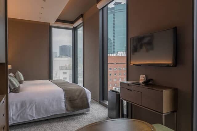 床から天井までタテに長く都会の風景を切り取る窓もドラマチック。客室の向きによって窓の景色は異なりますが、写真は新橋駅方面の眺望です。