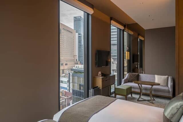 31.3平米の「スーペリアコーナーツイン」はその名のとおり角部屋にあって、2方向に窓がある開放的な客室です。リビングスペースにはソファーとテーブルが置かれ、上層階の客室なら都会の眺望を楽しめます。