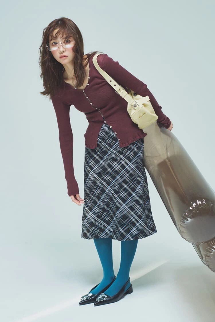 今季注目のカラータイツは、ハッキリとしたお目立ちカラーが正解。スカートの柄の色を拾えば、なじみもバツグン!