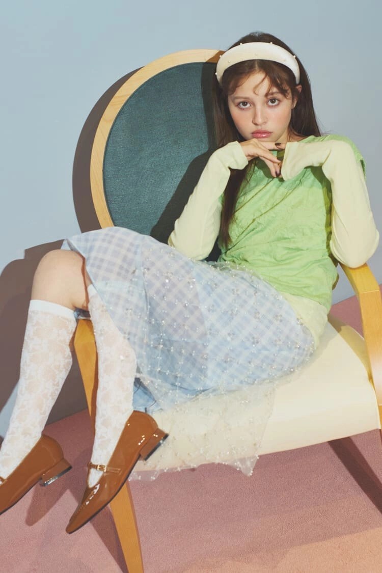 つきチュールラップスカート 3,960円/Lumier カチューシャ 660円/ラティス ソックス 1,430円/靴下屋(Tabio)ストラップパンプス 8,300円/Olu.