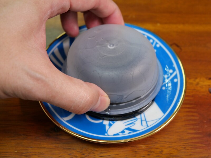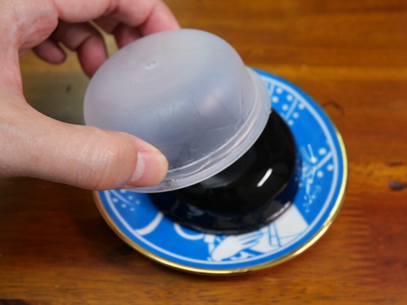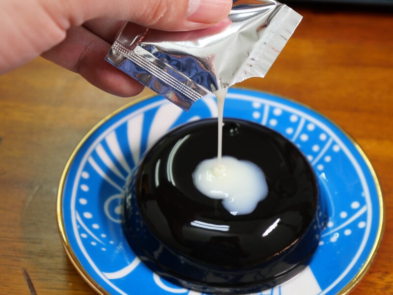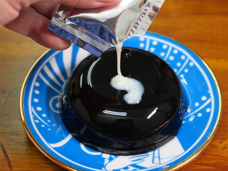 実はこのゼリーには練乳がついてくる。その練乳をかけて食べても良いらしいので、さっそくかけてみたが、むしろ漆黒レベルが強調されてブラックホール状態に。