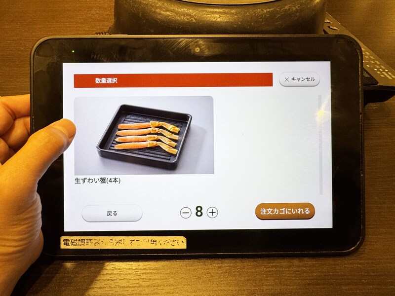着席し、タッチパネルから生本ずわいがに食べ放題をオーダーしたら、焦らず、ゆっくり、蟹をオーダーする。蟹を山ほど食べたい気持ちは理解できるが、食べ放題なので、一気にたくさんオーダーしなくていい。
