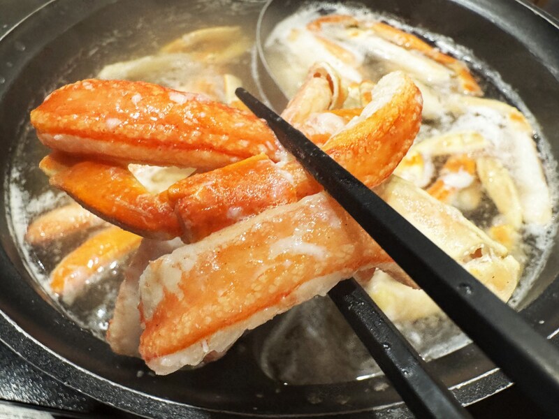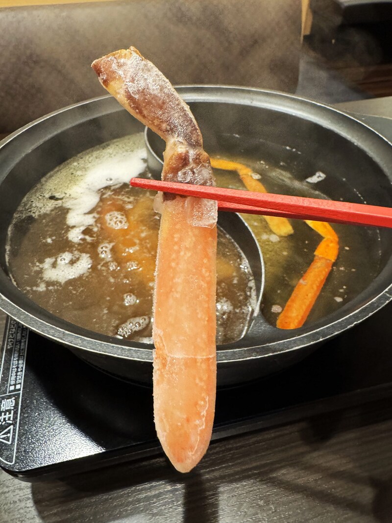 凍った状態の蟹はツヤツヤで肉厚。新鮮だからなのか、まったく臭みを感じない。つまり、しゃぶ葉は、蟹のクオリティに妥協していない。ごまかしてない。しっかり客が食べることを考えている。