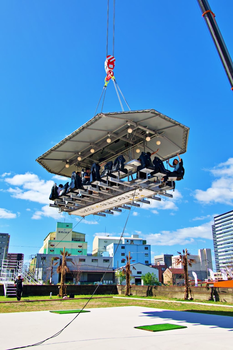 「Dinner in the Sky」はベルギーで誕生し、これまでに世界65か国・10,000回以上開催されてきた空中レストランで、テーブルとイスをクレーンで地上から約40mの地点までつり上げ、空中で食事を楽しむというもの。ちなみに高さ40mは、ビル13階ほどに相当するそうです!