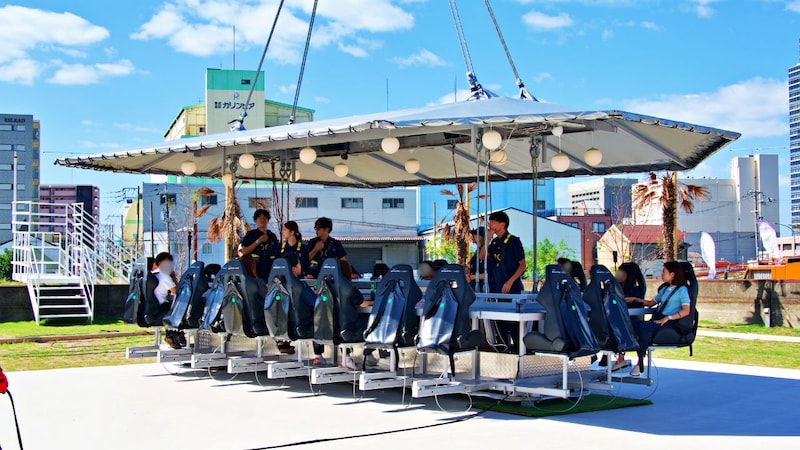 今回の「Dinner in the Sky OSAKA」は最大22人まで搭乗可能。一つ一つのシートもしっかりした大きさ。まるでゲーミングチェアのような座り心地のよさを感じられます。