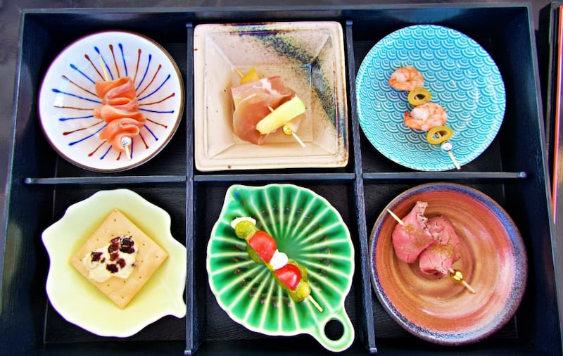 前回の東京開催からアップグレードされ、より“お酒とのペアリング”が楽しめるカジュアルなコースに。ローストビーフ、生ハムメロン、カクテルシュリンプなど6種のおつまみが盛られ、串で提供されるので片手で食べやすいのもうれしいポイント。