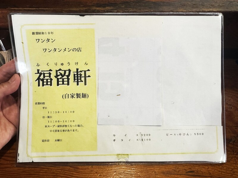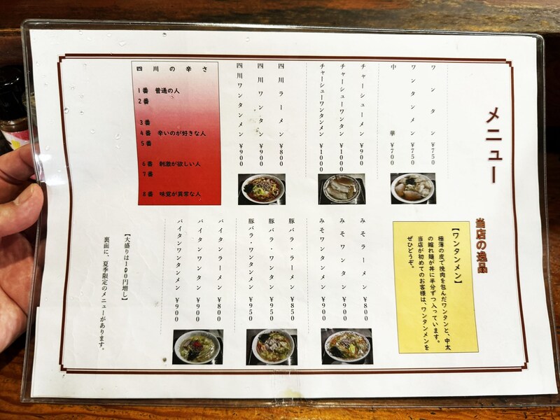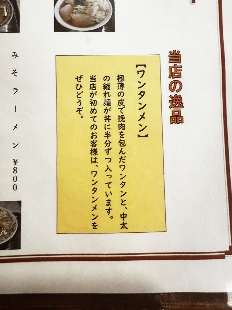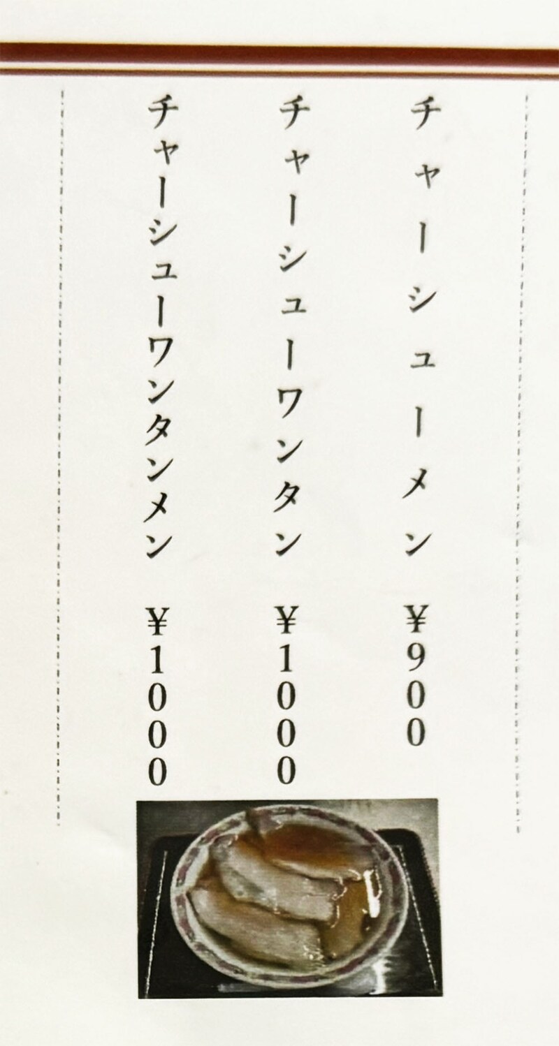 メニューを見てみると、名物は「チャーシューワンタンメン」(税込1000円)であることがわかります。麺とワンタンが半々で入ったチャーシューメンという感じですね。