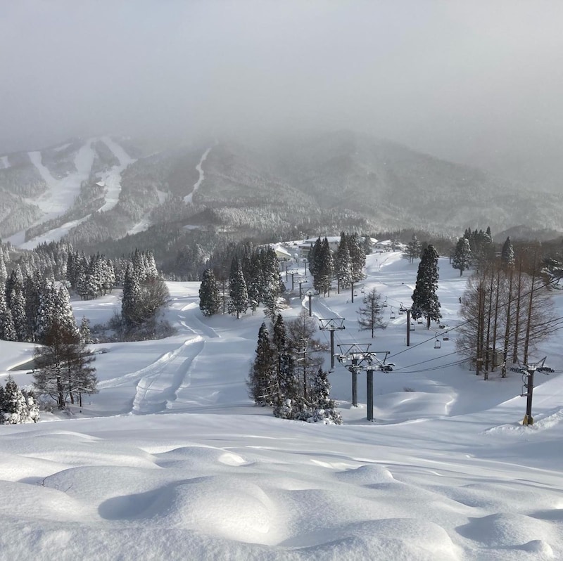 福井県寄りに位置するスノーウェイブパーク白鳥高原は、日本海側からの雲の影響で、立地的にたくさんの降雪がある。ひと晩で1m以上降る日も多く、そうなると山はドパウダーの白い海と化す。