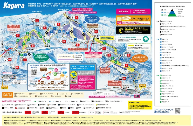 苗場からのアクセスも可能で便利なかぐらは、上越の他のスキー場が降っていなくても、どうしてここだけはこんなに降るんだろうってくらいたくさん雪が降る。また、重い雪質と言われる上越エリアで、かぐらは比較的雪が軽い。