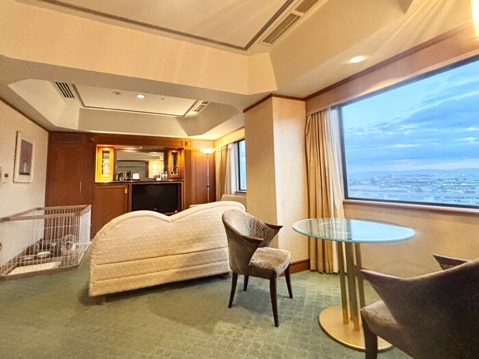 広々としたジュニアスイートルーム(19階・64.4㎡ 海側)。客室にはワンちゃんのための備品を完備しております。