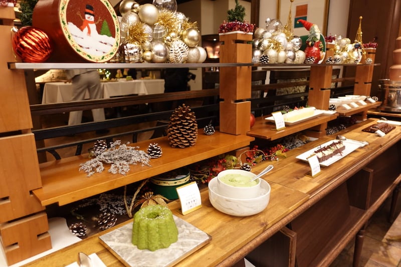 パーティー気分を盛り上げてくれるホールケーキは5種。ドイツ発祥のチョコレートとチェリーのケーキ「フォレノワール」は、クリスマスシーズンの定番スイーツで、ビュッフェ用にホールケーキスタイルで登場しました。