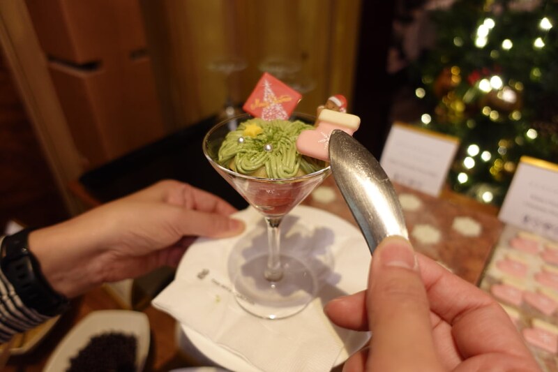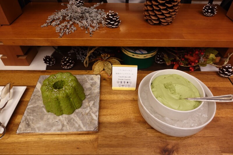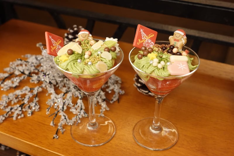 パティシエが目の前で仕上げてくれるライブデザート「ピスタチオクリームとストロベリーゼリーのクリスマスリース」。いちごゼリーの上にドーナツ型のパンケーキのような生地をのせ、そこにピスタチオと抹茶をブレンドしたクリームを絞ったミニパフェです。