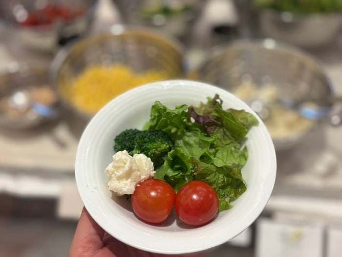 自分好みに盛りつけてゆくのも、ブッフェでのおたのしみ。新鮮なお野菜がたくさん並ぶサラダバーは、ドレッシングの種類も豊富。色とりどりのサラダにテンションがあがります。