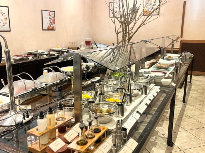 朝食は、ブッフェ形式でいただけます。中央のカウンターには、フレッシュなサラダバーに煮物などのお惣菜、ベーコンやスクランブルエッグなどのお料理がたくさん並んでいます。