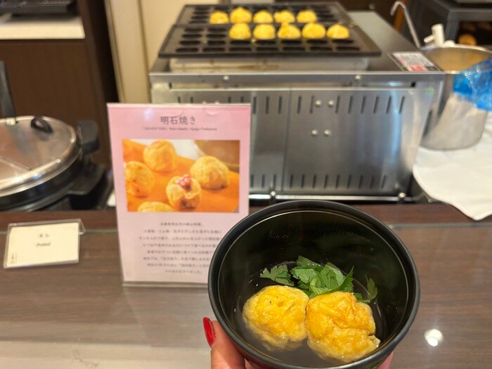目の前で焼きたてをいただける、明石焼きをいただきました。温かいお出汁に、卵たっぷりの明石焼き。トッピングの三つ葉はお好みで、ふわふわの明石焼きと優しい風味のお出汁の風味が、新しい一日のスタートにぴったり。