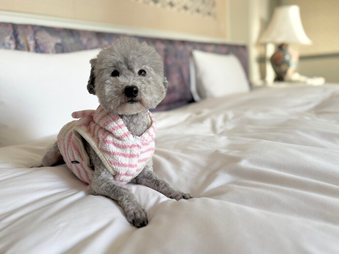 朝食をいただいたあとも、お部屋でゆっくり出発の準備。広々としたジュニアスイートルームには、ワンちゃん専用のベッドなどもあるので、出発までの時間もゆったりとした気持ちで過ごすことができました。