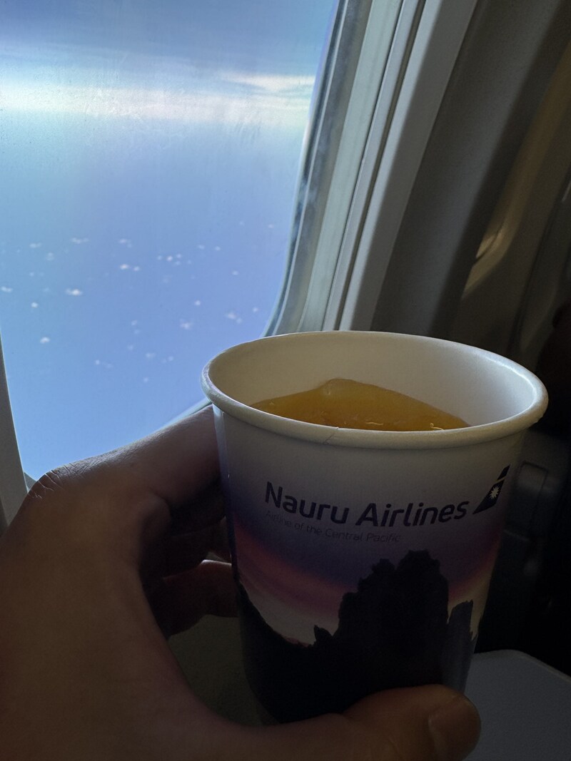 ナウル航空の飛行機が飛び立ち、安定飛行になると、ドリンクをもらいました。