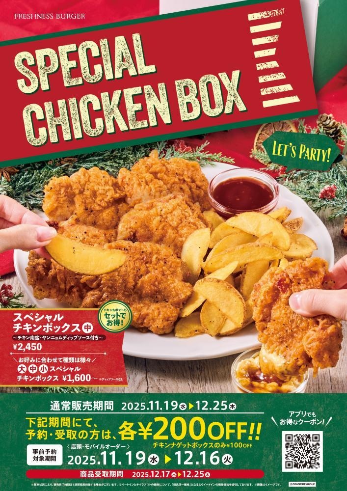 フレッシュネスバーガーは、2025年11月19日から期間限定で、ホームパーティーやクリスマスにぴったりな『スペシャルチキンボックス』を販売しています。