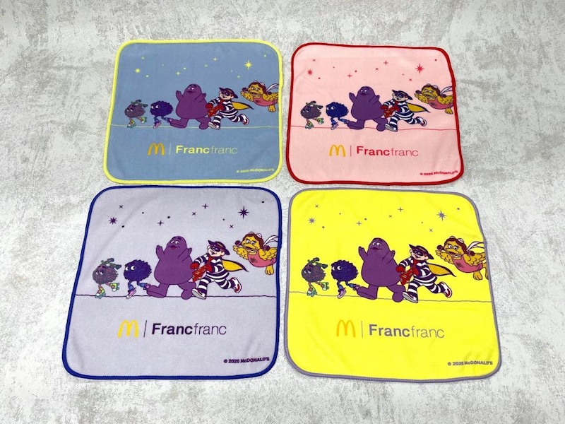 パステルカラーに、マクドナルドファミリーのグリマス・ハンバーグラー・バーディ・フライフレンズの楽しげな場面を描いたタオル。フチやブランドロゴとの配色が、保温・保冷バッグとリンクしています。