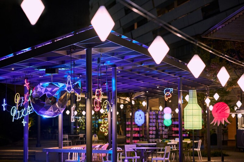 イベント時間になると、ガーデンエリアみやぐりんは、無数の提灯がやさしい明かりを灯す幻想的な空間へと様変わり。「PIKAPIKA横丁」を、新世界や道頓堀の賑わいを映し出す大きな張りぼて看板と、かつて新世界の夜を照らした「ふぐ」の形のミラーボールが彩ります。