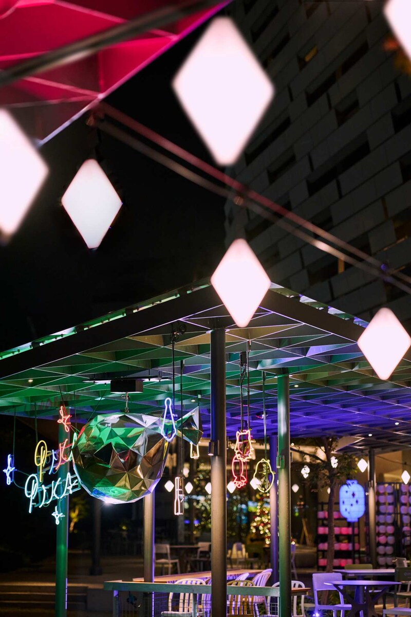 さらに、ホテル壁面の外装膜を使用し、宿泊者全員で参加できる巨大なBINGOも実施。OMO7大阪のBINGOは数字ではなく、大阪にまつわるイラストや関西弁で構成されていることもポイントです。