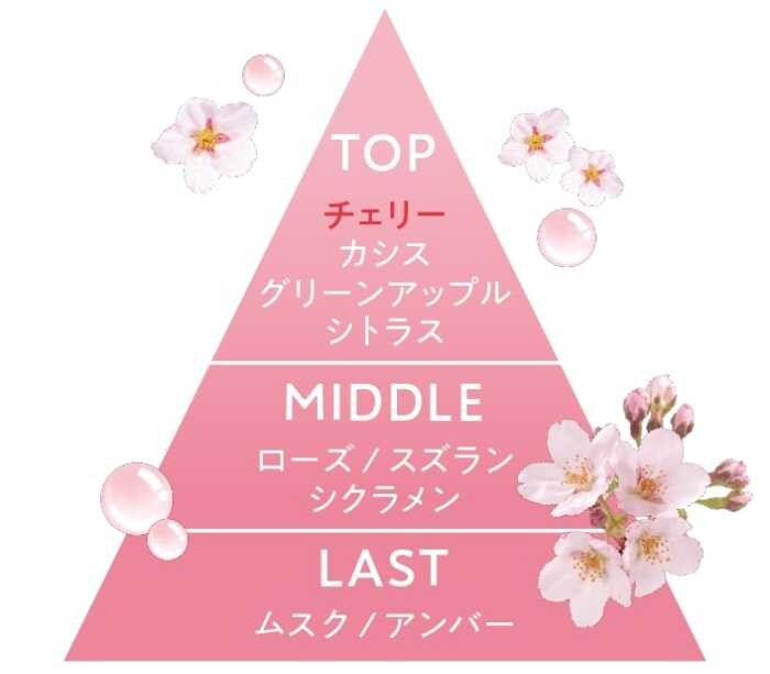 チェリーの華やかさとシトラスの清々しさ、ムスクのやさしさが調和し、舞い落ちる桜に包まれるような香りです。