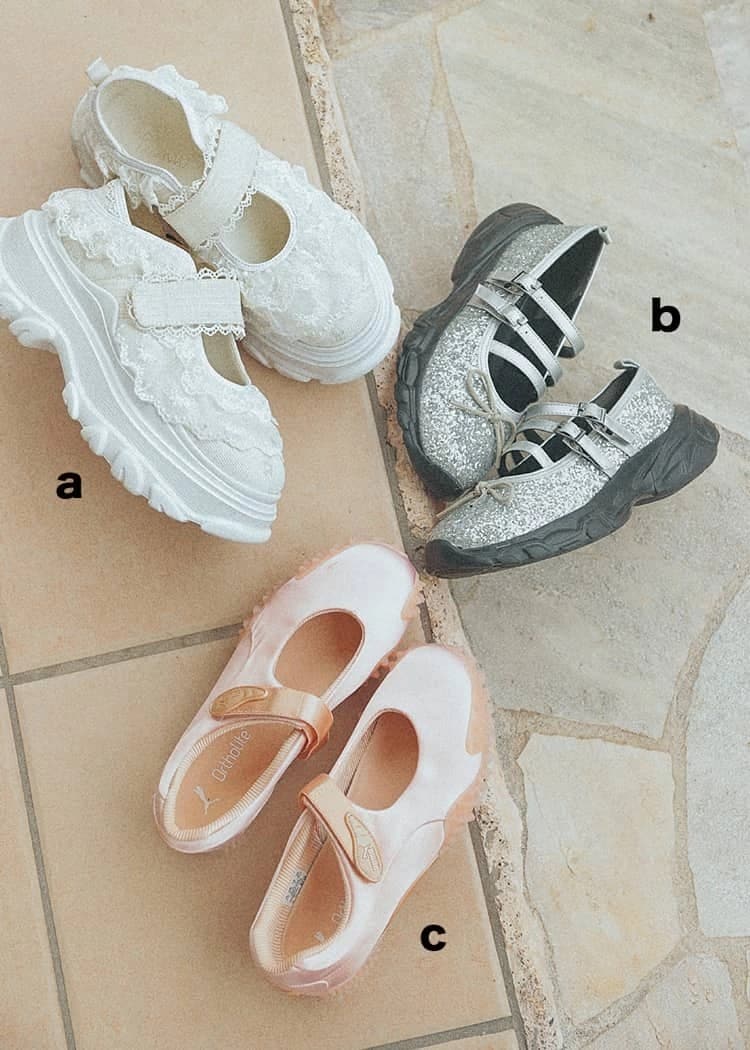 スポーティー×フェミニンの意外な組みあわせこそ、今っぽバランス♡ ひとくせある甘さが、足元のおしゃれを格上げしてくれる。