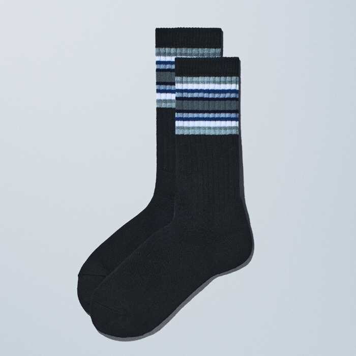 ラインソックス(390円・税込429円)は、グレーとネイビーを基調にした冬の色を配色。22cm-25cm、25cm-28cmの2サイズ展開で、抗菌防臭加工と肉厚のパイル編みが魅力です。