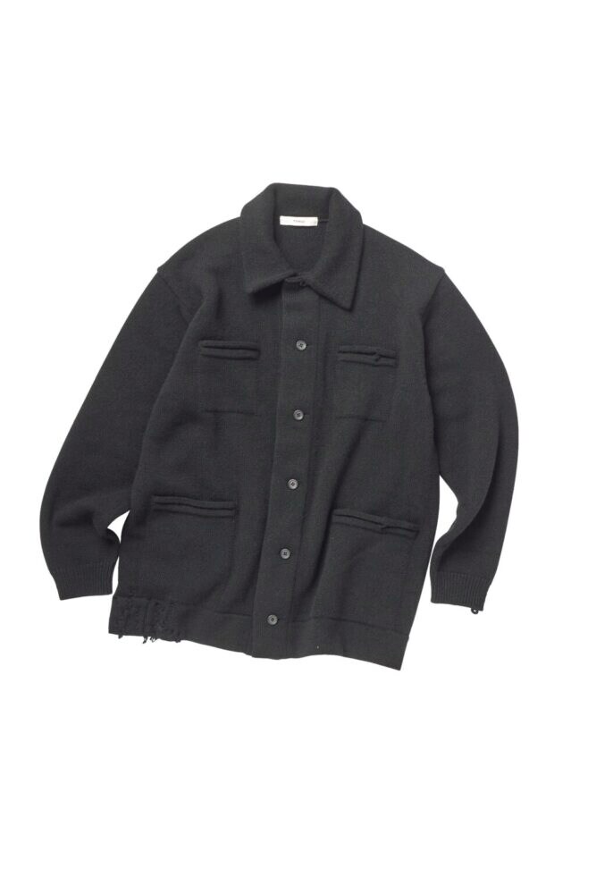 一見シンプルな黒のニットですが、よく見ると目落ちやほつれのようなディテールが施され、人の手で編まれたような温かみがあります。襟付きで4つポケットのデザインも魅力的。ウールとカシミアを撚糸した贅沢な素材は、着込むほどに柔らかく肌に馴染みます。袖を通すたびに素材の良さを実感できる、そんな安心感も魅力のひとつ。「トーナイ」らしい、素材への探求心と誠実なものづくりが感じられる1着です。