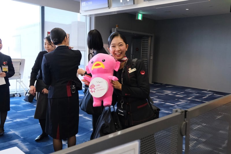 搭乗ゲートの電光掲示板には普段では見ることのない【大阪(関西)行】の文字。機体は番組5周年に合わせて「JL5555」と掲示された。