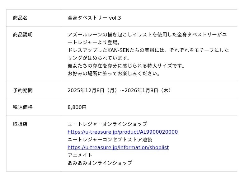 株式会社ユートレジャー(本社:東京都新宿区、代表取締役社長:青木 興一、株式会社ケイ・ウノの連結子会社)は、スマートフォン向けゲームアプリ「アズールレーン」とのコラボレーションアイテム「描き下ろし全身タペストリー vol.3」の予約受け付けを2025年12月8日(月)~2026年1月8日(木)の期間、ユートレジャーオンラインショップ、ユートレジャーコンセプトストア池袋にて行います。