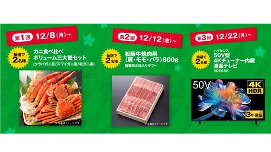 加えて、『GEO クリスマスSALE 2025 フォロー&リポストキャンペーン』では、ゲオの公式Xアカウントをフォローして、同アカウントの該当キャンペーンポストをリポストすると、食べ比べができる三大蟹セットなどの豪華賞品が抽選で当たります。また、全3回の投稿を全てリポストするとPlayStation (R)5(CFI-2000A01)が抽選で当たります。