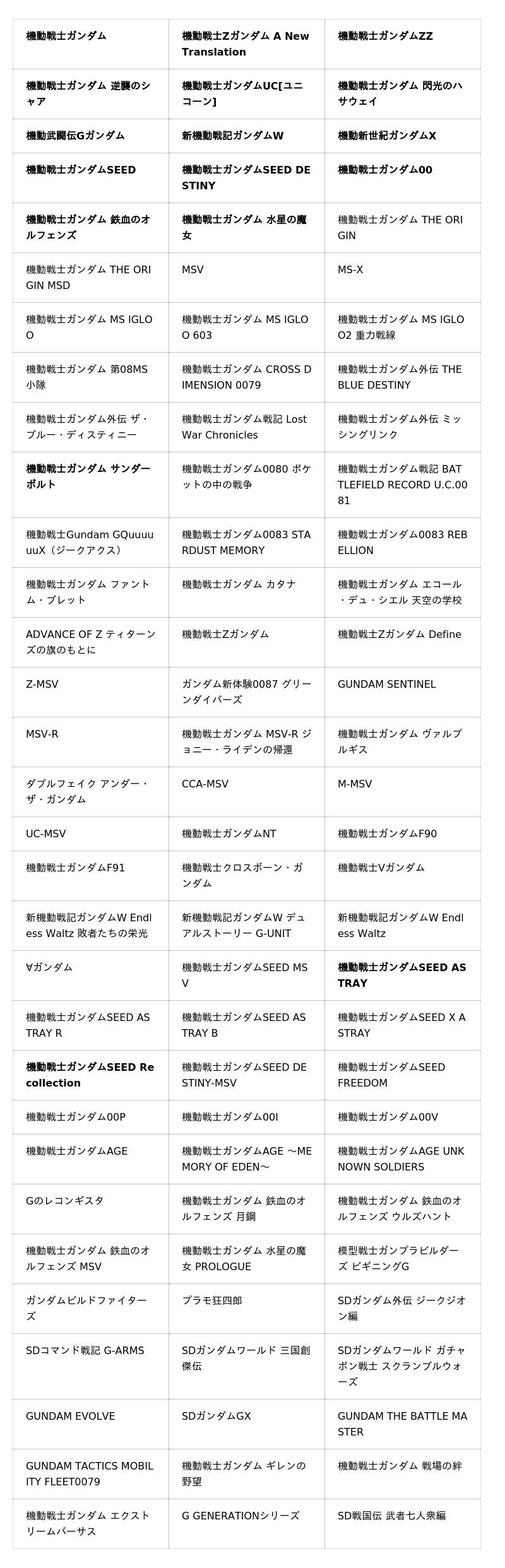 ※太字はメインステージ及び、ヒストリーステージとしてシナリオが収録されている作品です