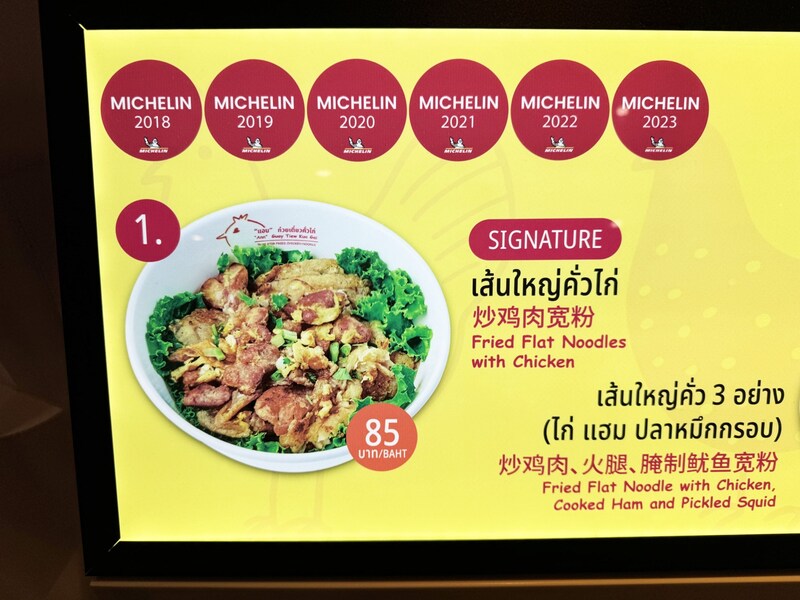 焼きそばが美味しすぎて、ミシュランの称号を獲得した食堂があります。それはタイ・バンコクの「アン クアイティアオ クアガイ」(Ann Guay Tiew Kua Gai / 991 Rama I Rd, Pathum Wan, Bangkok 10330, Thailand)。なんと、この店舗、フードコートにあります。